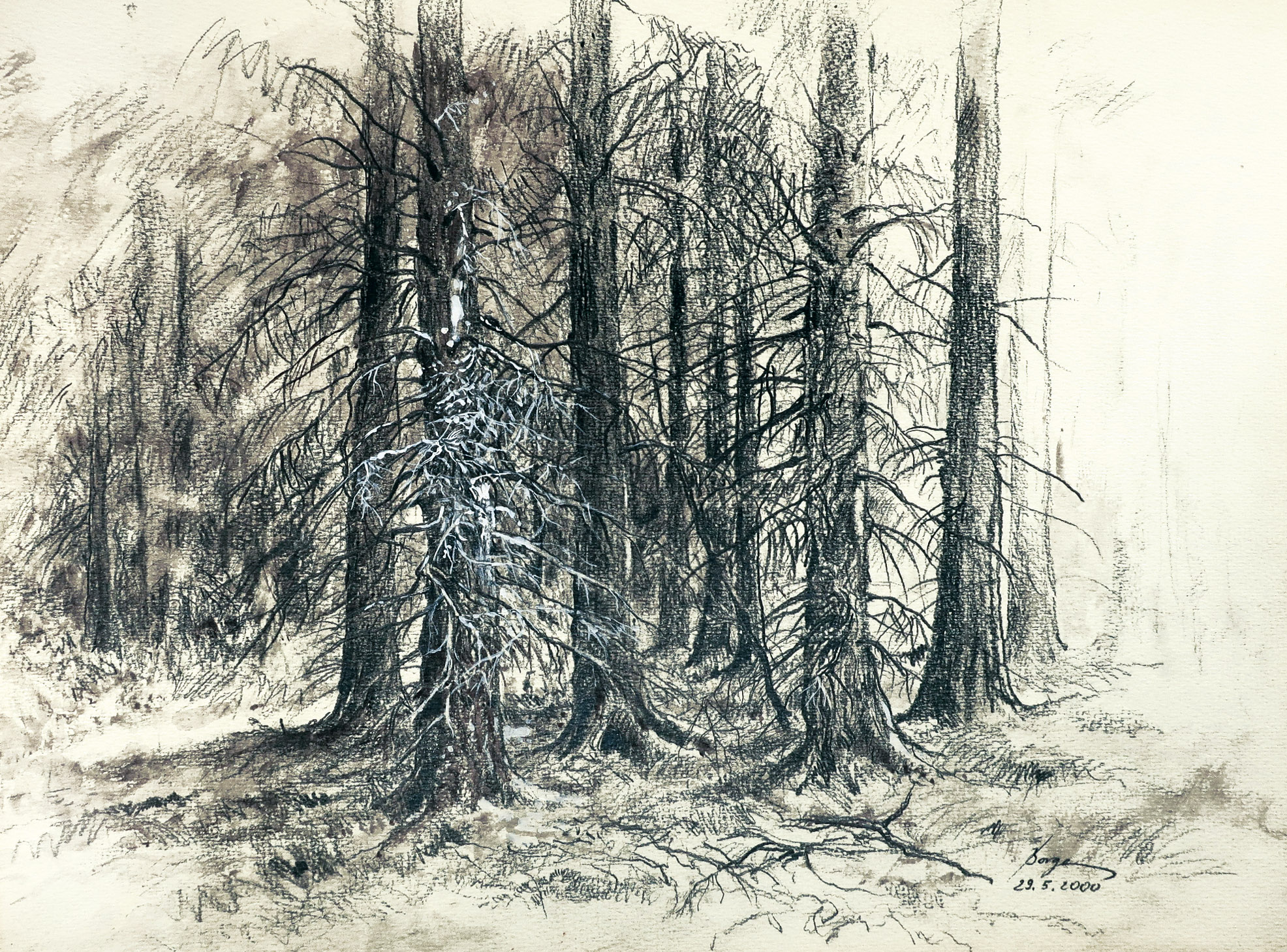 Johannes Borges war ein begnadeter Zeichner, der sich auf seinen Wanderungen durch die Landschaftsräume immer wieder inspirieren ließ und seine Sinneseindrücke unbedingt bildlich festhalten musste. Es sind vor allem Landschaften, und dann gibt es noch einige Porträts. Unspektakulär sind die Motive, die einer scharfen Beobachtungsgabe folgen. Johannes Borges hat nicht nur gezeichnet. Es sind auch malerische Erkundungen überliefert, die in atmosphärischer, altmeisterlicher Lasurtechnik entstanden. Er beobachtete den Wald zu unterschiedlichen Tageszeiten, sah die jahreszeitlich bedingten Veränderungen, das ewige Wachsen und Vergehen.