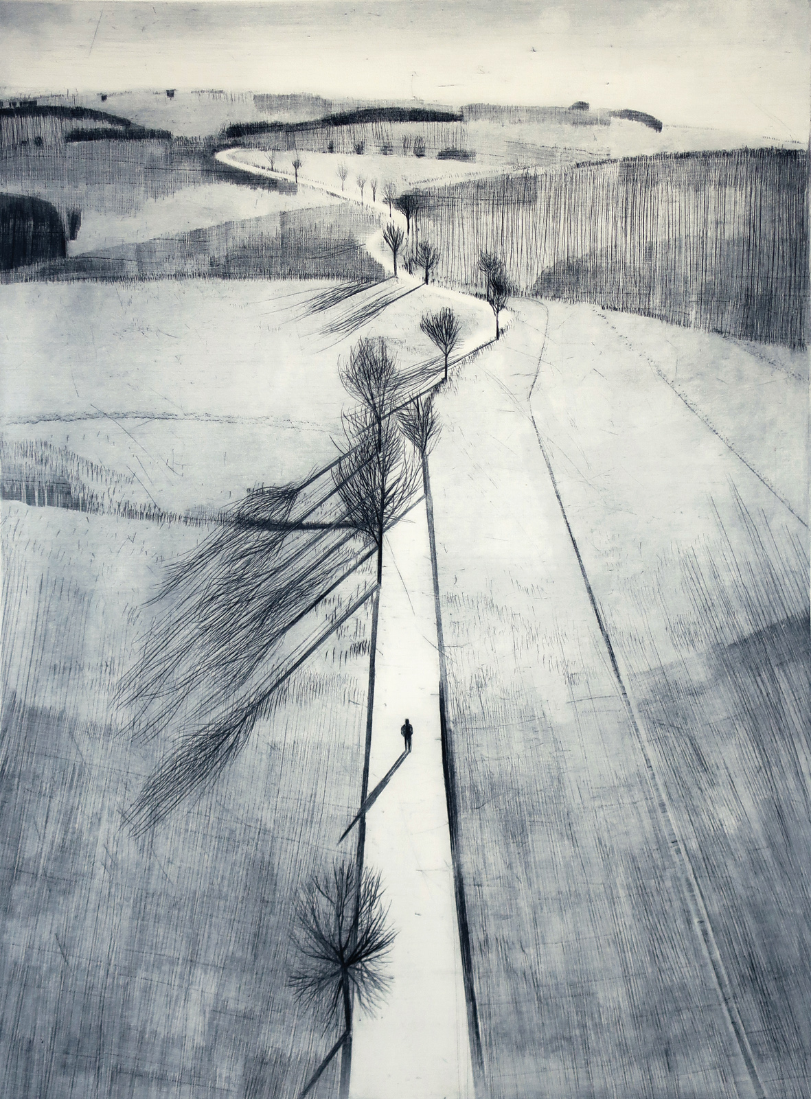 Katja Lang, die überwiegend mit der Technik der Kaltnadelradierung arbeitet, liebt die Samtigkeit der Linien und Schraffuren, die beim Druck entstehen und eine damit zusammenhängende atmosphärische Transparenz. Sie stellt in ihrer Erinnerung Orte und Landschaften nach, die in ihrem Leben besondere Spuren hinterließen: Landschaften der Erinnerung, die im weitesten Sinne der Realität verpflichtet sind; Topografien der Erinnerung. Dieses Wechselspiel von erahnbaren Realien und fantasievoller Deutung kann sehr anregend sein.