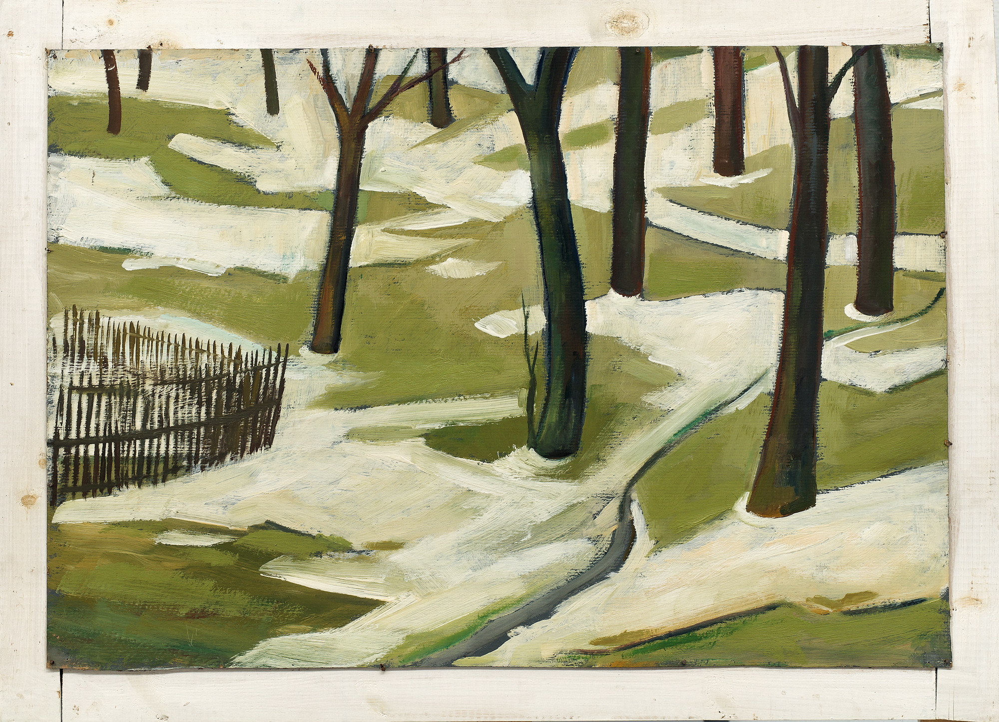 Das Gemälde ist 1973 entstanden und trägt keinen Titel. Es zeigt den Ausklang des Winters, einer für das Erzgebirge typischen Jahreszeit. Der vereinzelte Schnee zwischen den Bäumen wirkt schmutzig, das Grün der Wiesen ist noch relativ kraftlos sowie von Ockertönen durchsetzt und in der rechten Bildhälfte ist ein vermutlich aus Schmelzwasser bestehender Bach zu sehen: Es deutet alles auf Tauwetter hin. Wahrscheinlich zeigt das Bild eher einen Teil eines Gartens oder einer Parkanlage als ein Stück Wald. Eventuell begegnete die Situation dem Künstler in seiner Heimatstadt Aue.
